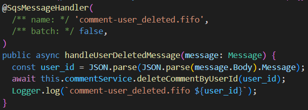 위와 같은 식으로 작성해준다. 실제 처리하는 코드는 service에 작성하는데, user_deleted 이벤트의 경우 service의 deleteCommentByUserID() 함수에, post_deleted 이벤트의 경우 service의 deleteCommentByPostID() 함수에 작성하였다.