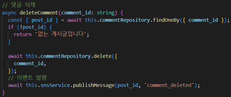 댓글이 삭제되었다는 이벤트도 비슷하다. 댓글 삭제 코드를 작성하고, publishMessage에 post_id와 함께 'comment_deleted' 이름의 이벤트를 발행한다.