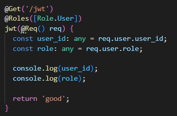 그리고 이를 사용하기 위하여, 특정 권한만 접근하게 할 때 @Roles()를 사용하여 권한을 설정해준다.