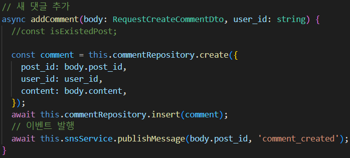 위는 댓글을 생성하는 코드인데, 이전처럼 댓글을 생성하는 코드를 작성한 뒤, 마지막에 snsService의 publishMessage에 이벤트를 발행하면 된다. 댓글 생성이므로 'comment_created'의 이름으로 발행한다. 댓글이 작성된 post_id도 함께 보낸다.