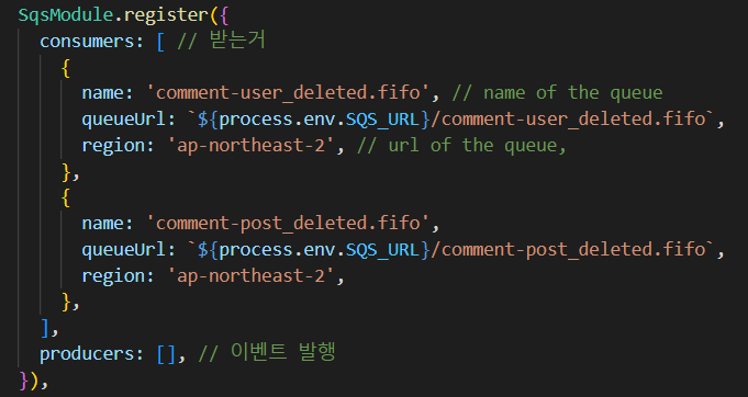 다른 서비스에서 발생된 이벤트를 받기 위하여, module에서 SqsModule를 추가한다. 이 코드 역시 imports에 작성하면 되고, 다른 서비스에서 comment 서비스로 받을 이벤트에 따라 다음과 같이 작성하면된다.