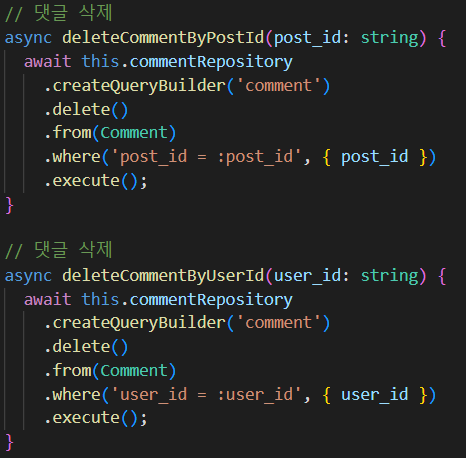 유저가 삭제되거나 게시글이 지워진 경우 모두 해당 이벤트가 발생하면 댓글도 자동으로 지워져야 하므로, 둘 다 댓글을 삭제하는 함수이다.