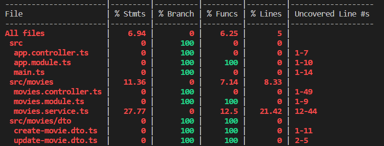 movies.service.ts에서 12.5%의 function, 21.42%의 line, 그리고 12-44 line은 테스팅되지 않았다고 나온다.