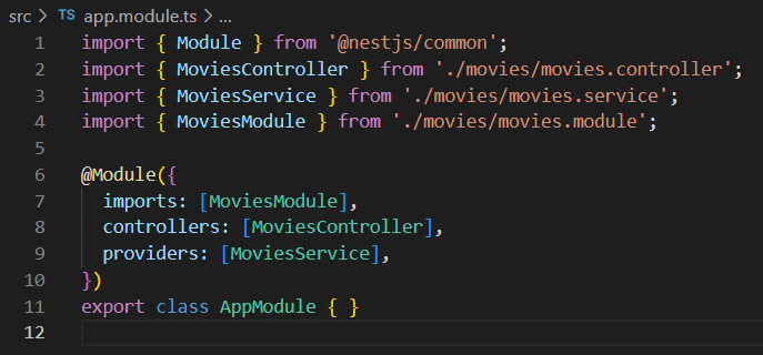 그런데 사실 app.module은 AppController와 AppProvider만 가지고 있어야 한다. 즉, 우리가 만든 MoviesService랑 MoviesController를 movies.module로 옮길 것이다.