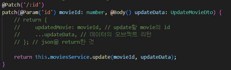 그리고 Controller와 Service에서 updateData 타입을 UpdateMovieDto로 추가해줌