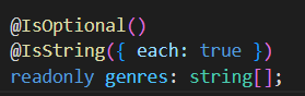 테스트하다가 create-movie.dto.ts에서 genres는 필수가 아닌 값으로 바꾸기 위해 @IsOptional()을 추가