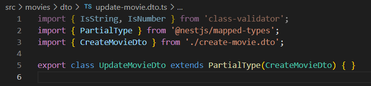 아까 만든 update-movie.dto.ts는 create-movie.dto.ts의 코드를 그대로 복사했고, 다른 점이 모든 데이터가 필수가 아니라는 점밖에 없다.