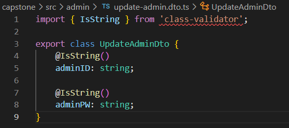 - dto를 만들다가 @IsString()으로 adminID가 string 형인지 확인해주는 데코레이터인데, 이를 import하려니 라이브러리를 불러오는 데 오류가 생겼다. 그래서 class-validator를 따로 설치해주었다.