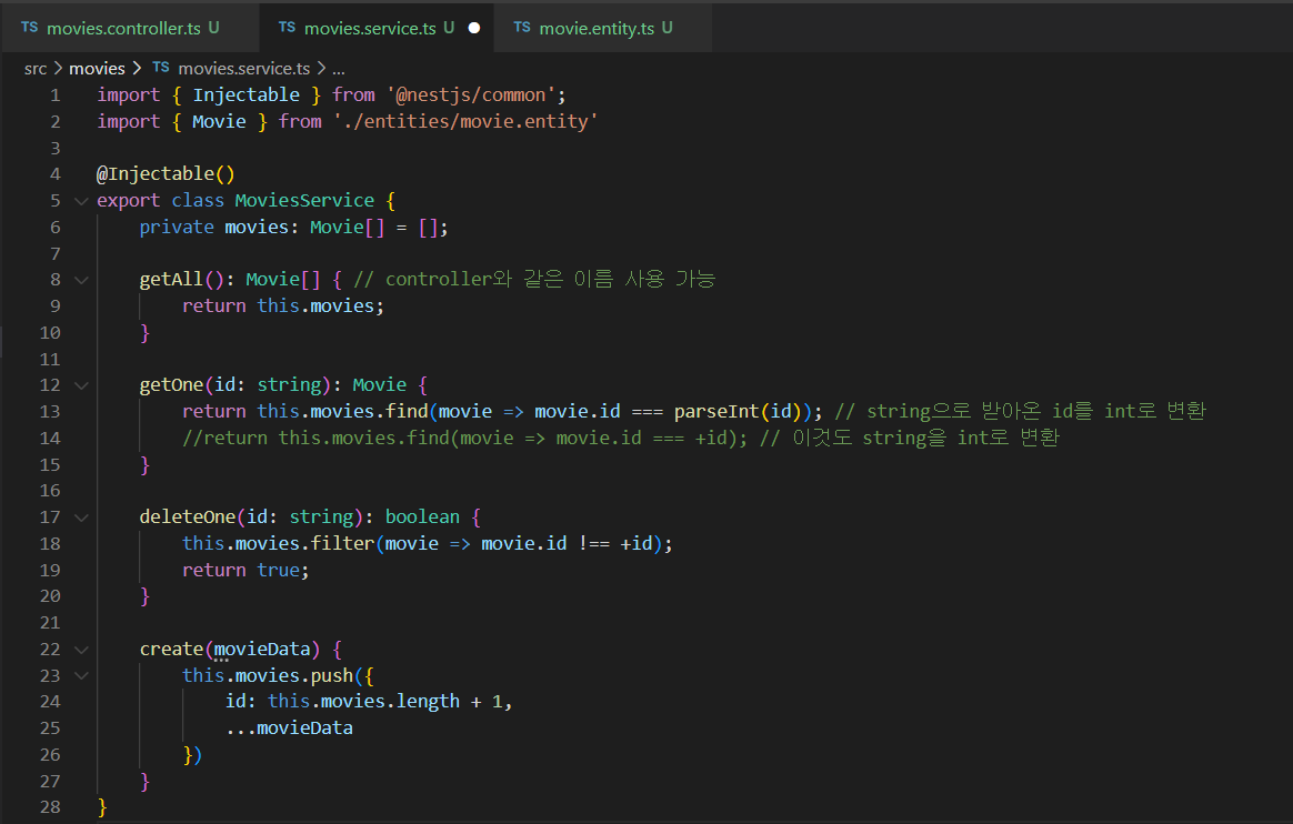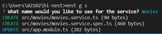 movies 폴더에 movies.service.ts와 movies.service.spec.ts 파일이 생성되었다. spec 파일은 역시 테스트용이고, 이번에는 삭제는 하지 않았다. (사용하지도 x)