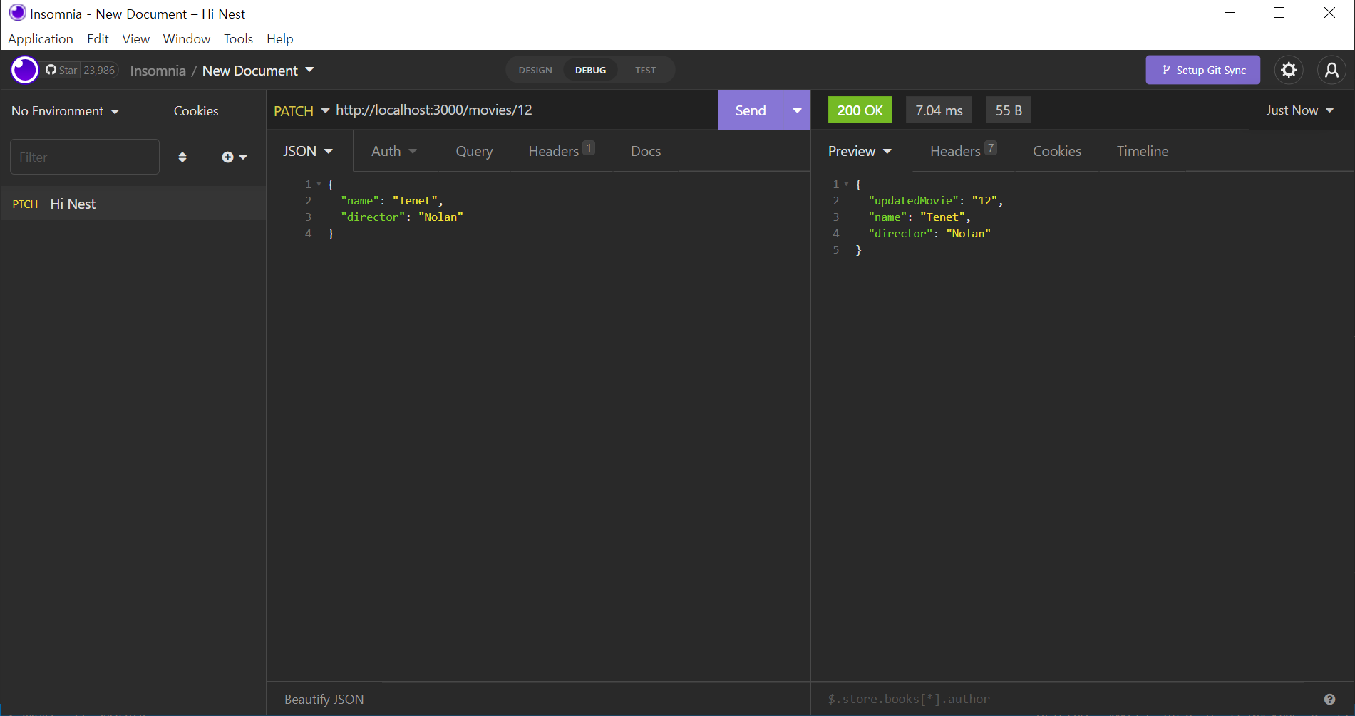 Patch를 수정하고 다시 insomnia에서 요청하여 출력된 결과이다.