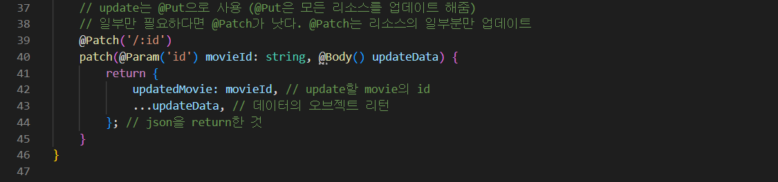 Delete, Update하는 함수를 @Delete와 @Patch 데코레이터를 사용해 만들어주었다.